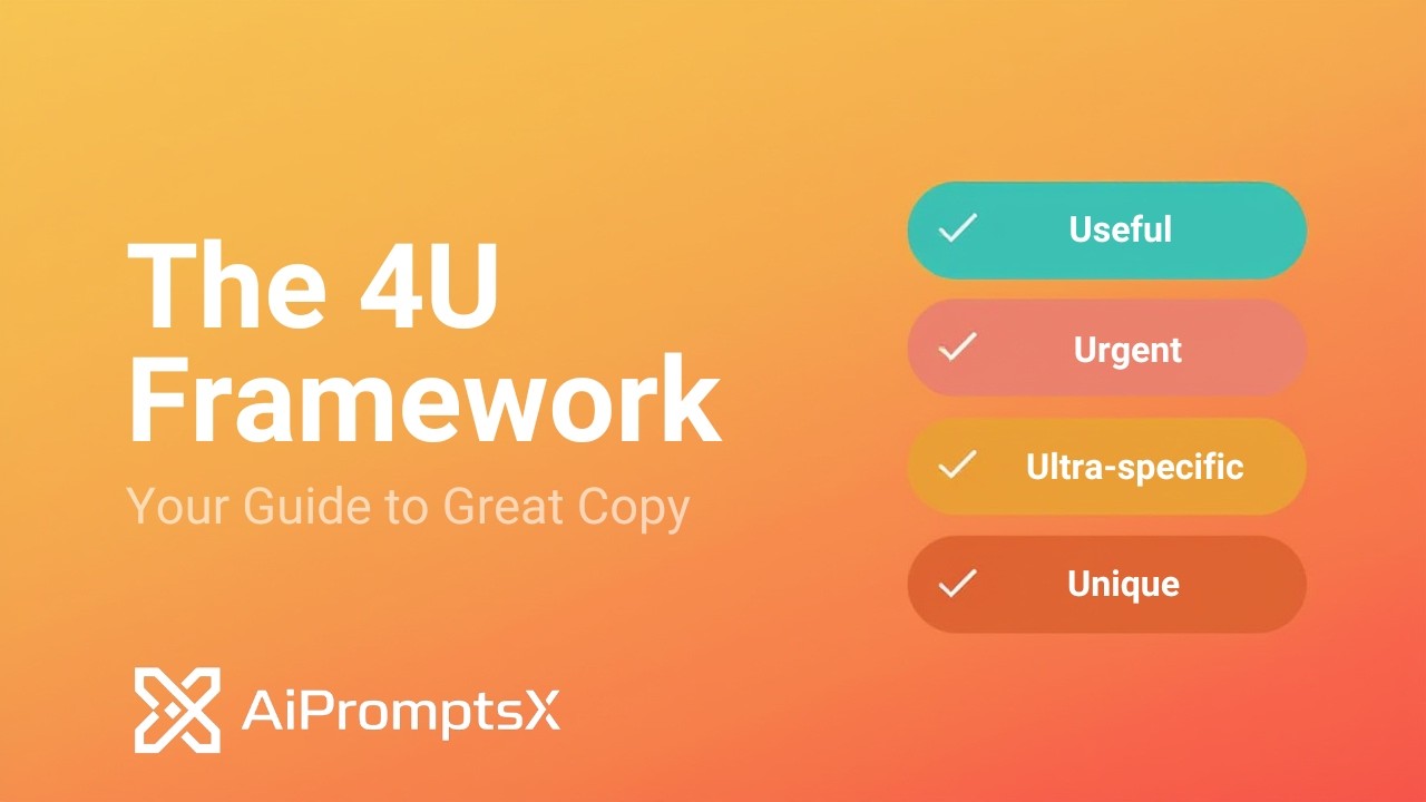 The 4-U Framework (Urgent, Unique, Useful, Ultra-specific) is a structured approach to prompt engineering designed for generating compelling, high-converting marketing and sales copy with AI systems. This framework is built on proven copywriting principles that drive reader engagement and action.